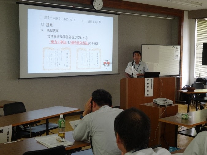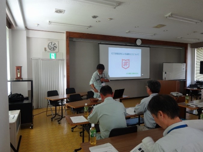 7月30日に南魚沼地域振興局(地域整備部・農林振興部)と合同の技術研修会を実施しました。内容は、①ICT工事について②農地事業の優良工事施工に向けてと題し、座学と現地での研修を行いました。ICTということもあり、長岡地域整備部からも参加があり総勢70名となり、内容も充実したものとなりました。