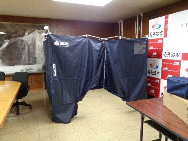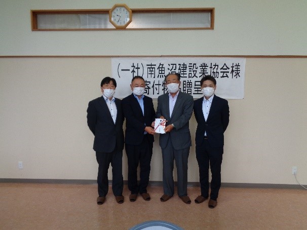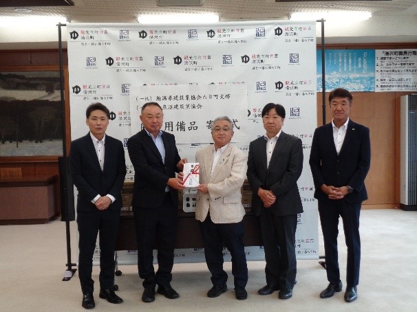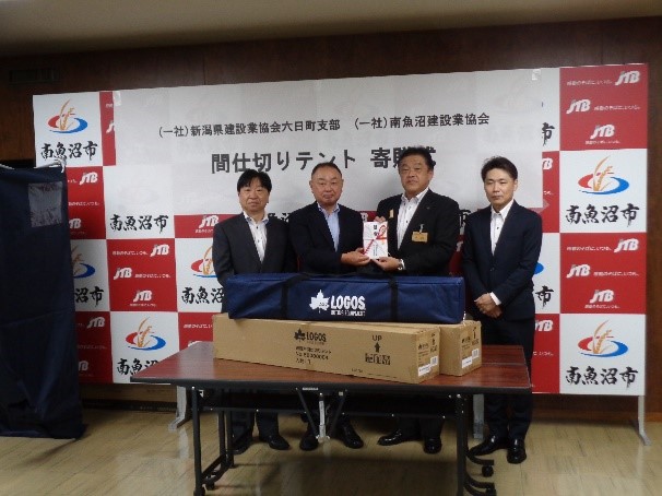 南魚沼市役所では、市長に当協会から避難所開設時の「間仕切りテント」を52張(220cm×220cm×180cm)52張(南魚沼建設業協会から17張、新潟県建設業協会六日町支部から35張)、湯沢町役場において、町長に災害停電時用蓄電池4台(南魚沼建設業協会から2台、新潟県建設業協会六日町支部から2台)を贈呈しました。